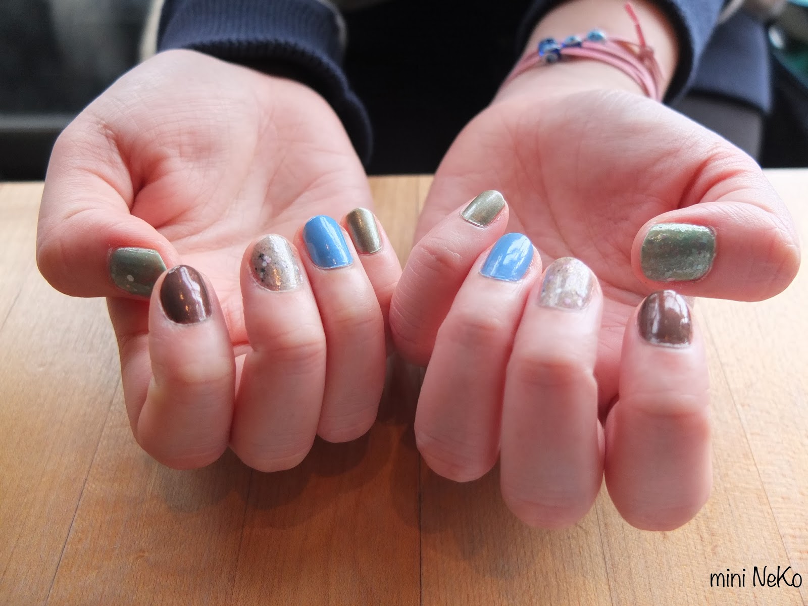 Alors contrairement aux couleurs traditionnels du printemps (pastels, mièvres, porcelaine), Cat nous a concocté une collection très "terre/herbe" (green- earthy) et quand même une touche de bleu pour nous rappeler qu'on aimerait le revoir ce ciel bleu! Je dois dire que Cat a changé sa base, pas d'odeur forte cette fois-ci et toutes mes swatchs sont 2 couches avec Mavala comme base et Rainbow Honey comme topcoat (qui sent bon le gingembre miam!). Voici donc la collection "April Showers Bring May Flowers"