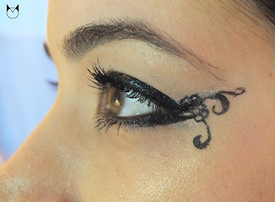 Merci à ma BFF Anne-Lise d'avoir joué au cobaye pour moi. Honnêtement, faire de l'éclectique avec les couleurs reçues qui sont très belles mais trop classiques (nudes), j'ai vraiment du improviser. Je vous propose donc d'unifier votre paupière grâce à la base et aux couleurs nudes (mix de The Velvets et des crayons 2-en-1) puis de créer des volutes à la place du classique "oeil de chat" (ou le "winged liner") à l'aide d'un liner. Vous pouvez rajouter un peu d'argenté autour des volutes pour donner un peu de relief et puis hop mascara! La difficulté réside dans votre capacité à reproduire la même chose de l'autre coté. Mention Winner: Le mascara vraiment génial "Forbidden Volume", un résultat bluffant! Bon c'est un look pour des occasions "spéciales" mais cela a l'avantage de mettre en valeur n'importe quelle couleur d'iris :).